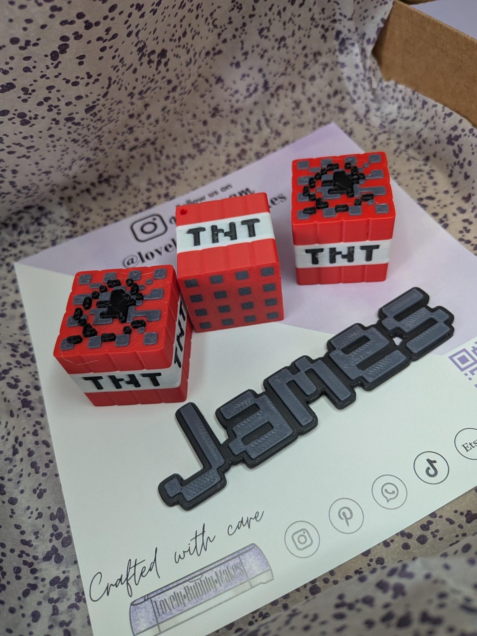 Acrylic Style Personalised Minecraft Inspired Layered Name Charm – 3D Food Safe Printed – Quality PLA – Lovely Bubbly Makes – TNT boxes