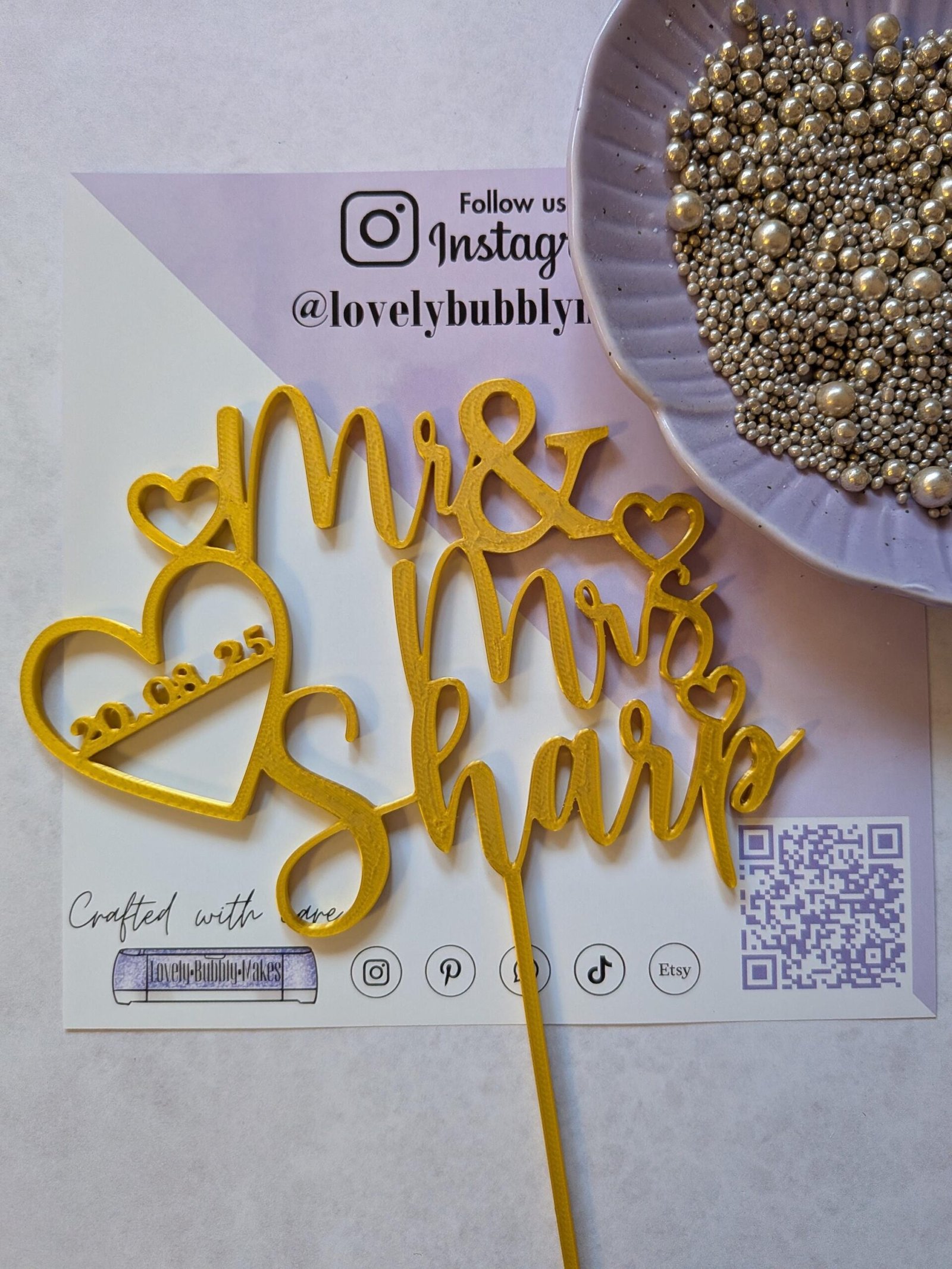 Acrylic Style Personalised Wedding Cake Topper – Mr & Mrs Name plus date – 3D Food Safe Printed – Quality PLA – Lovely Bubbly Makes