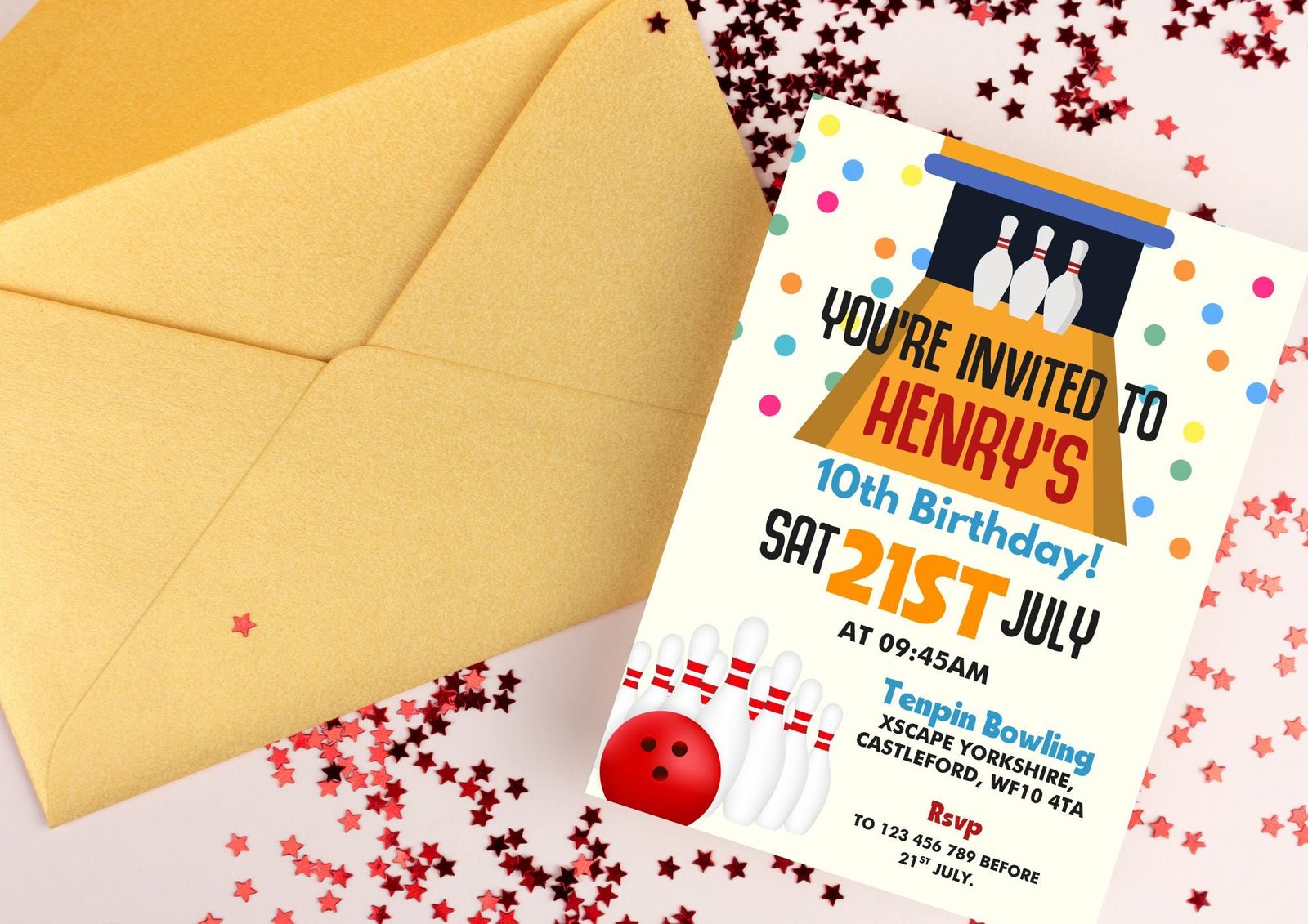 Invite your guests in style with this bowling themed invitation—perfect for a fun and energetic bowling party!