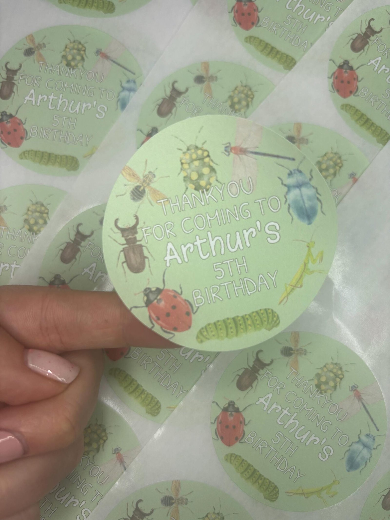Personalised Birthday Party Sticker – Thank you for coming to *names* party – Insect Bug Critter Theme