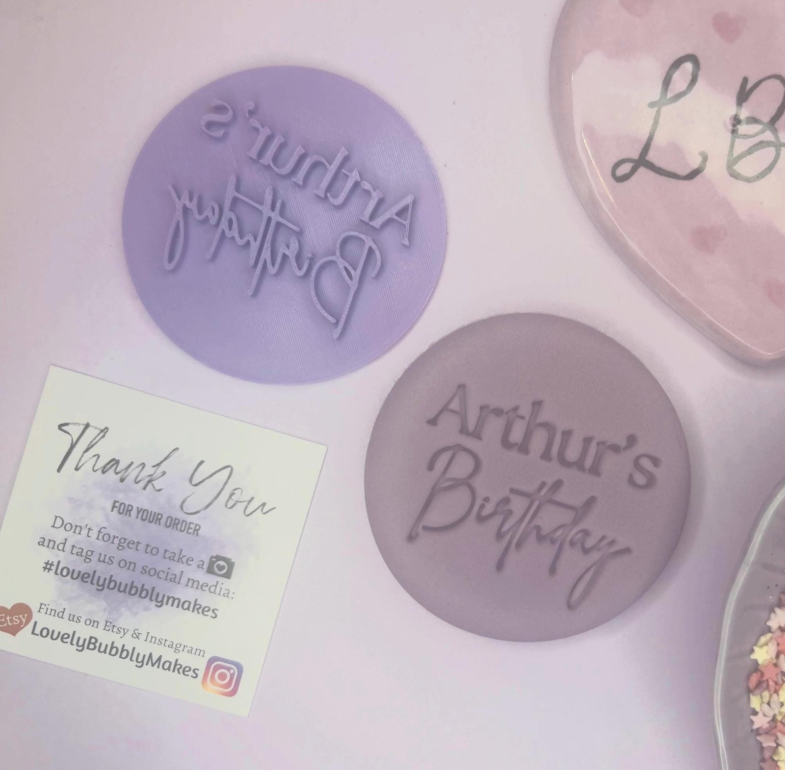Eco-Degradable Food Safe PLA: We care for the environment as much as you do. Our stamps are made from eco-degradable food safe PLA, ensuring it’s both eco-friendly and safe to use. All our stamps come in a signature lovely bubbly lilac colour as pictured.